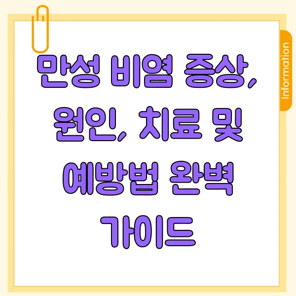 만성 비염은 완치가 어려운 질환이지만, 꾸준한 관리를 통해 증상을 조절하고 삶의 질을 개선할 수 있습니다. 개인의 증상과 원인에 따라 맞춤형 치료 계획을 세우는 것이 중요합니다. 😊