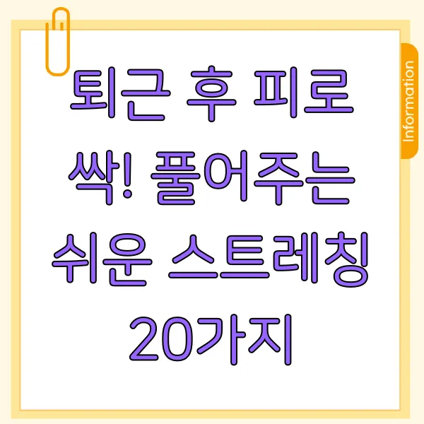퇴근 후 녹초가 된 몸, 그대로 침대에 뻗고 싶으시죠? 하지만 딱 10분! 잠깐의 스트레칭으로 놀라운 변화를 경험할 수 있습니다. 오늘 소개할 20가지 스트레칭은 목/어깨, 허리/척추, 다리/하체, 전신까지 꼼꼼하게 풀어줘 피로 회복은 물론이고 건강까지 챙겨줍니다. 퇴근 후 스트레칭, 지금 바로 시작해보세요! (키워드: 스트레칭, 퇴근 후 운동, 피로 회복, 목 어깨 스트레칭, 허리 스트레칭, 다리 스트레칭, 전신 스트레칭)
